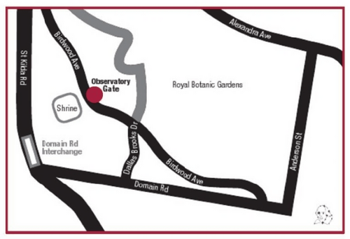 Southern Cross Lawn is opposite the Shrine of Remembrance, next to the gardens visitor centre & Observatory Gate